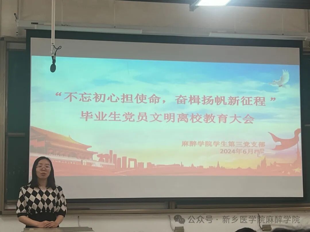 为贯彻落实2024届毕业生教育管理服务工作部署,营造健康、文明、和谐的毕业生离校氛围,6月12日,麻醉学院学生第三党支部于卫辉校区1201教室开展了以“不忘初心担使命,奋楫扬帆新征程”毕业生党员文明离校教育大会,会议由支部书记李佳主持。