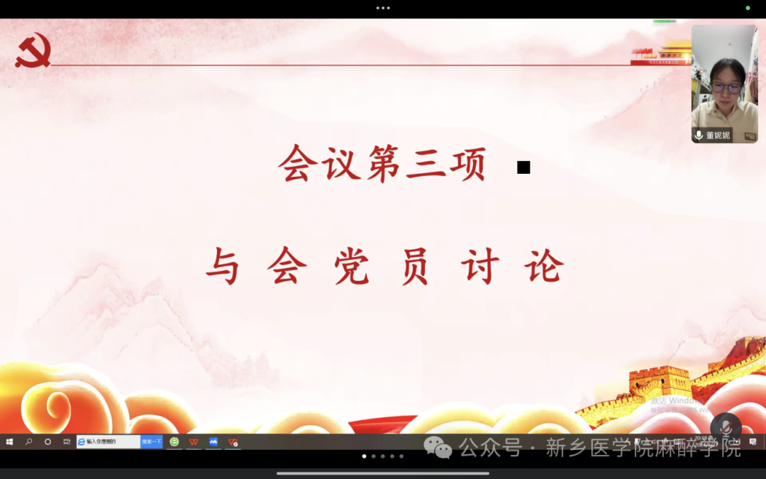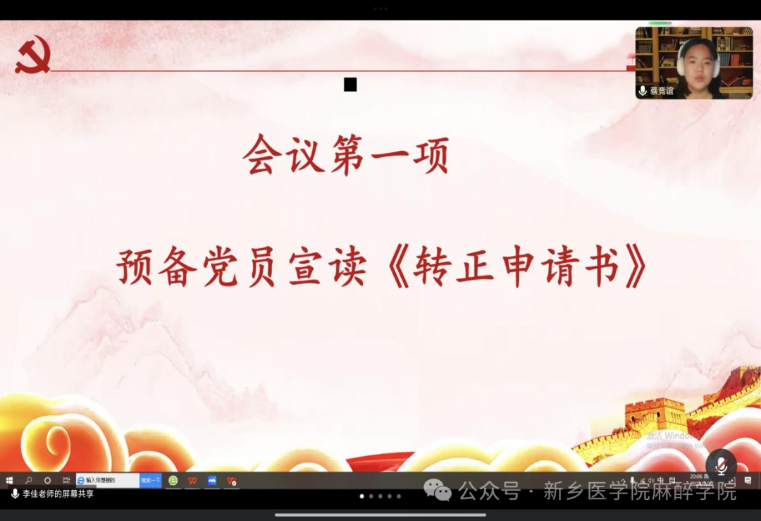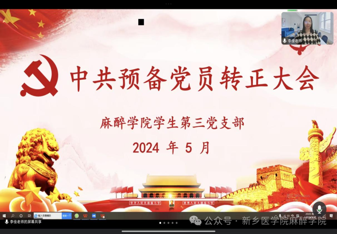 为加强基层党组织建设,为党组织吸收新鲜血液,进一步壮大党员队伍,麻醉学院学生第三党支部于5月26 日,以腾讯线上会议的形式召开了预备党员转正支部大会,会议由支部书记李佳主持。