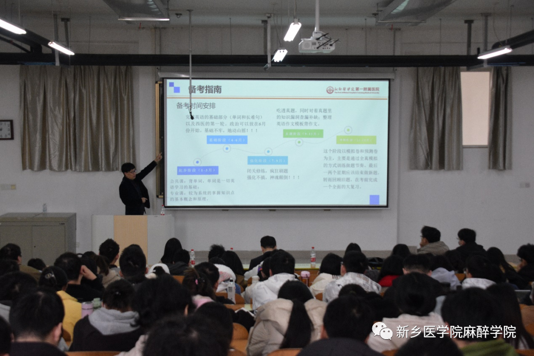 随后,岳修勤主任分享了近几年麻醉科医师数量、手术数量及近几年考研录取率等数据,分析了当前麻醉专业学生的就业形势,从麻醉学专业的角度出发,阐释了“考研深造比工作更具性价比”的观念,提出“时刻具有危机感及守时”的要求。同时以自己的考研经历为例,从考试科目、考试时间、择校技巧、备考时间安排等方面向同学们传授了实用的备考指南知识和经验,为同学们带来了针对性的考研及职业发展建议。其次,就最后一年大学专业的学习,岳修勤主任告诫大家要打牢专业知识基础,真正理解其内涵,同时要做到知行合一,在丰富专业课知识的同时,不断增强自身实践能力。最后寄语同学们“全力以赴,才能不留遗憾”希望大家摆脱懒惰、刻苦学习,以优异的成绩回报自己、回报父母、回报老师、回报学校。