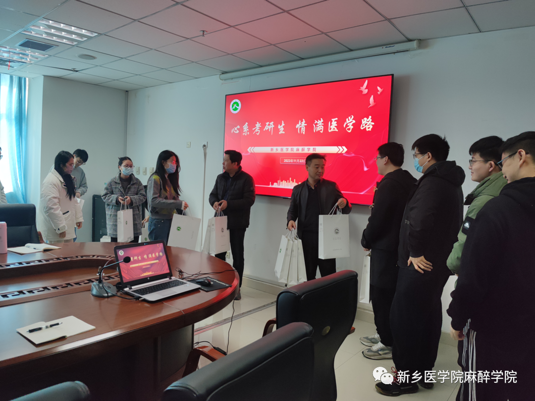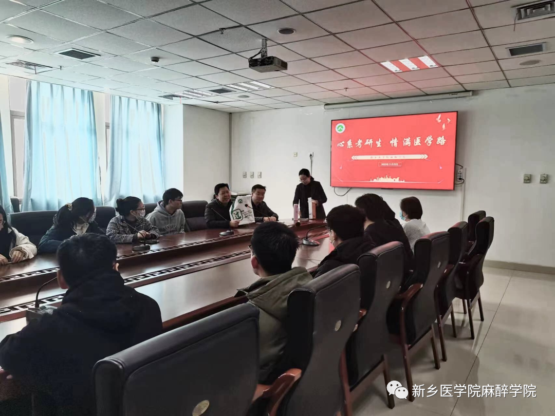 情系考研生,关怀暖人心。为提升考研学子的幸福感与满足感,坚定考研信心,11月22日,麻醉学院于新乡市中心医院规培楼会议室召开“心系考研生,情满医学路”助力考研慰问活动。本次活动由麻醉学院辅导员李佳主持,麻醉学院党总支副书记王琰、第四临床学院副院长顾颜胜、新乡市中心医院教务科科长薛艳玲、第四临床学院辅导员吴双受邀出席,2019级麻醉学专业实习生参加了本次活动。