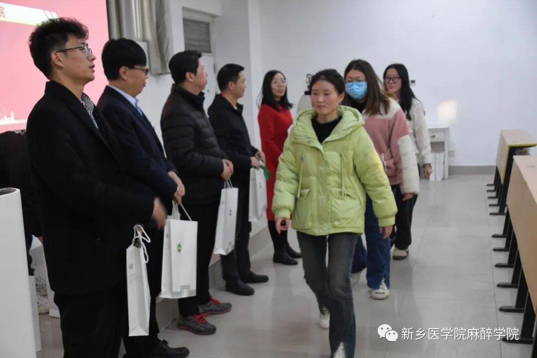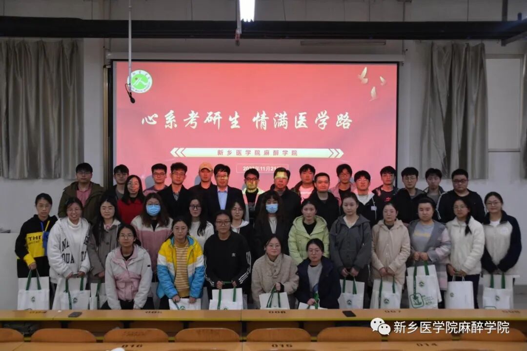 随后,麻醉学部主任岳修勤就麻醉医师的重要性和紧缺程度,他向大家展示了临床本科成长路线、临床专硕成长路线和学硕成长路线,将三种成长路线进行对比,向大家说明了考研更具性价比。接着,他通过将近五年考研录取率进行对比,展示了考研形势的严峻,提出大家要有拼搏精神,有韧性。随后,他给大家讲述了初试的考试科目和考试时间,以及择校技巧和备考时间安排,希望大家能在最后剩余的时间里坚定地走下去,不放弃,不气馁!活动最后,各位老师共同为大家发放了考研助力大礼包,向同学们送出了真挚的祝福,预祝大家考研成功上岸,并与大家合影留念。