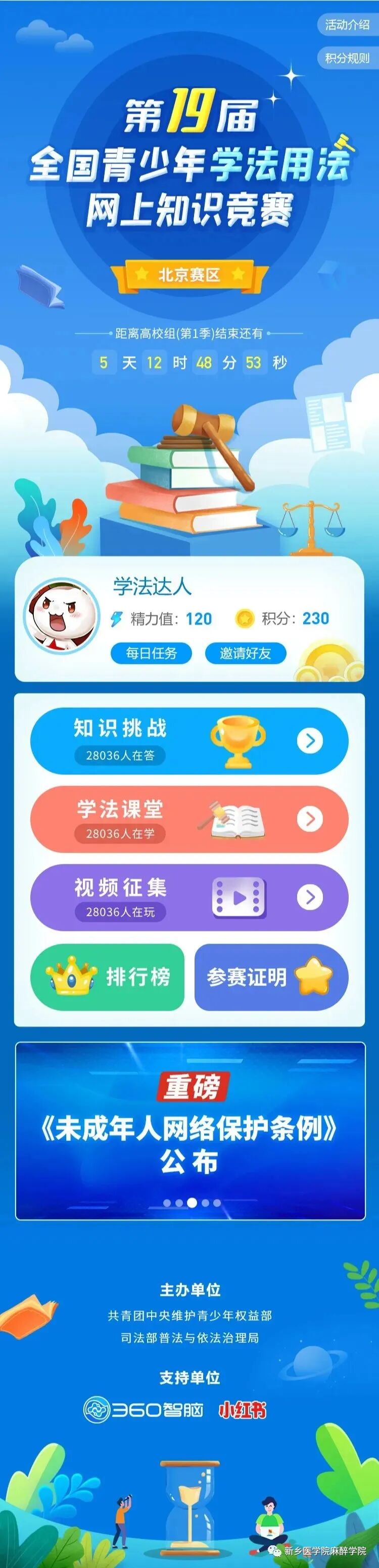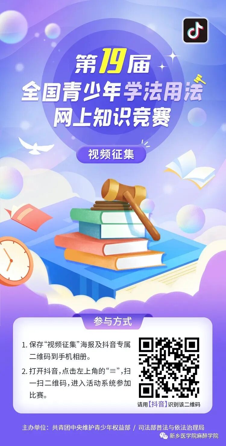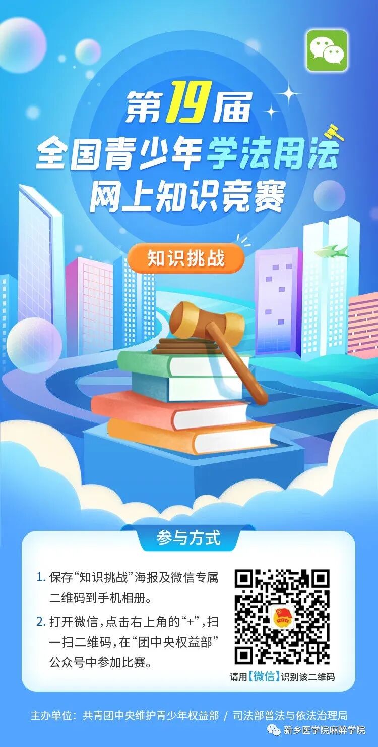 为全面贯彻党的二十大精神,深入贯彻落实习近平法治思想和习近平总书记关于青年工作的重要思想,认真实施共青团中央《关于贯彻实施“八五”普法规划深入开展青少年法治宣传教育的意见》,引导广大青少年尊法学法守法用法,做社会主义法治的忠实崇尚者、自觉遵守者、坚定捍卫者,2023年11月10日起,由共青团中央维护青少年权益部、司法部普法与依法治理局联合主办的第十九届全国青少年学法用法网上知识竞赛正式启动!