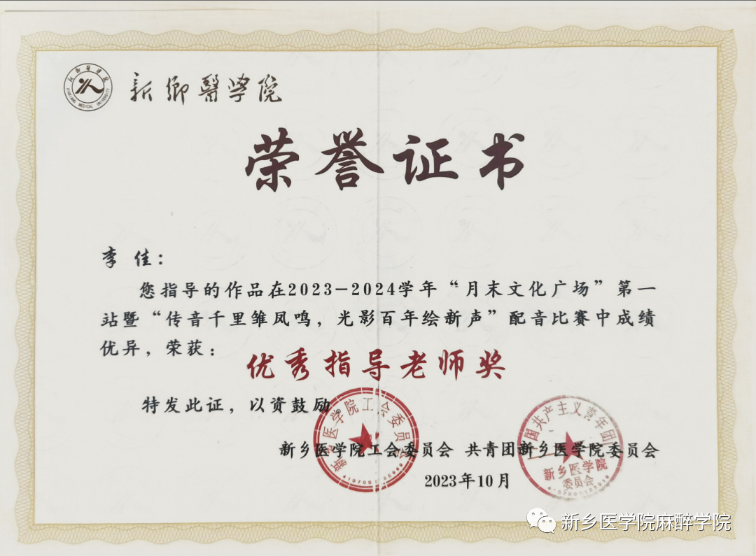 本次配音比赛总决赛于10月27日晚在我校第三报告厅举行,经过初赛,选拔赛的激烈竞争,包括麻醉学院队伍在内的12支队伍突出重围。其中,麻醉学院代表队的《以彼辈风华,照吾辈青年》节目,凭借精湛的演技、默契的配合和独特的创意,最终获得第三名,斩获二等奖。与此同时,麻醉学院辅导员李佳老师也在此比赛中荣获“优秀指导老师奖”。
