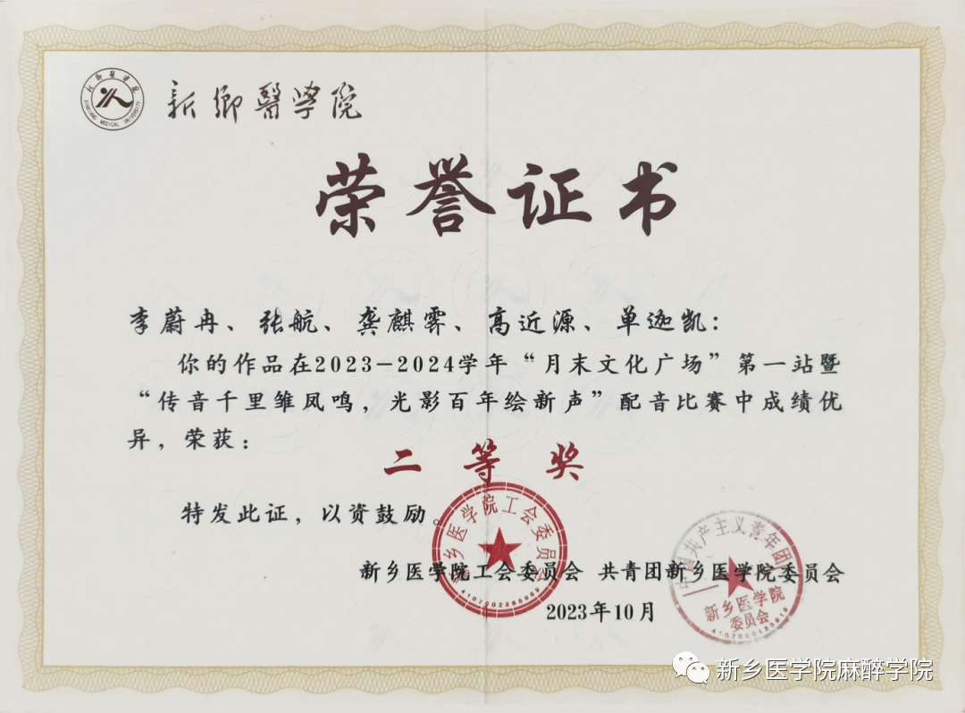 为提高学生的语言表达能力和口才技巧,给学生提供展示自我和交流学习的机会,营造良好的校园文化氛围,我校校工会、校团委主办,第三临床学院承办了华亿在线体育(中国)官方网站月末文化广场第一站“传音千里雏凤鸣,光影百年绘新声”配音比赛。此次比赛中,麻醉学院凭借出色的表现获得二等奖,展现了高质的团队合作与鲜明的个人风采。