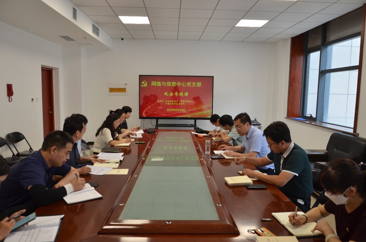 为深入开展学习贯彻习近平新时代中国特色社会主义思想主题教育,落实学校纪律教育月工作要求,6月20日下午,网络与信息中心党支部书记马俊峰以“坚定不移贯彻落实全面从严治党战略方针,打好党风廉政建设持久战”为题,为中心党支部全体党员讲主题纪法专题课,网络与信息中心科级以上干部、中心全体党员参加本次专题学习。。