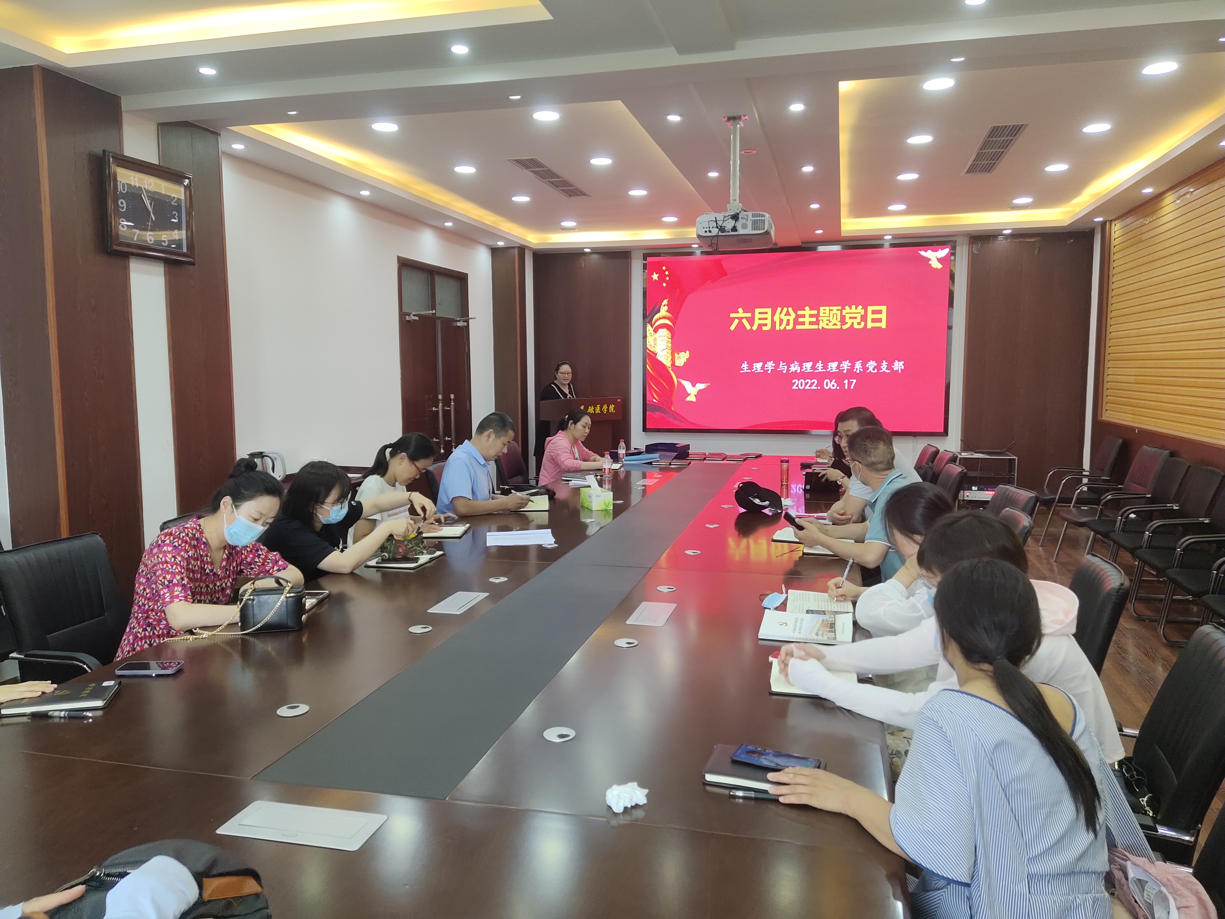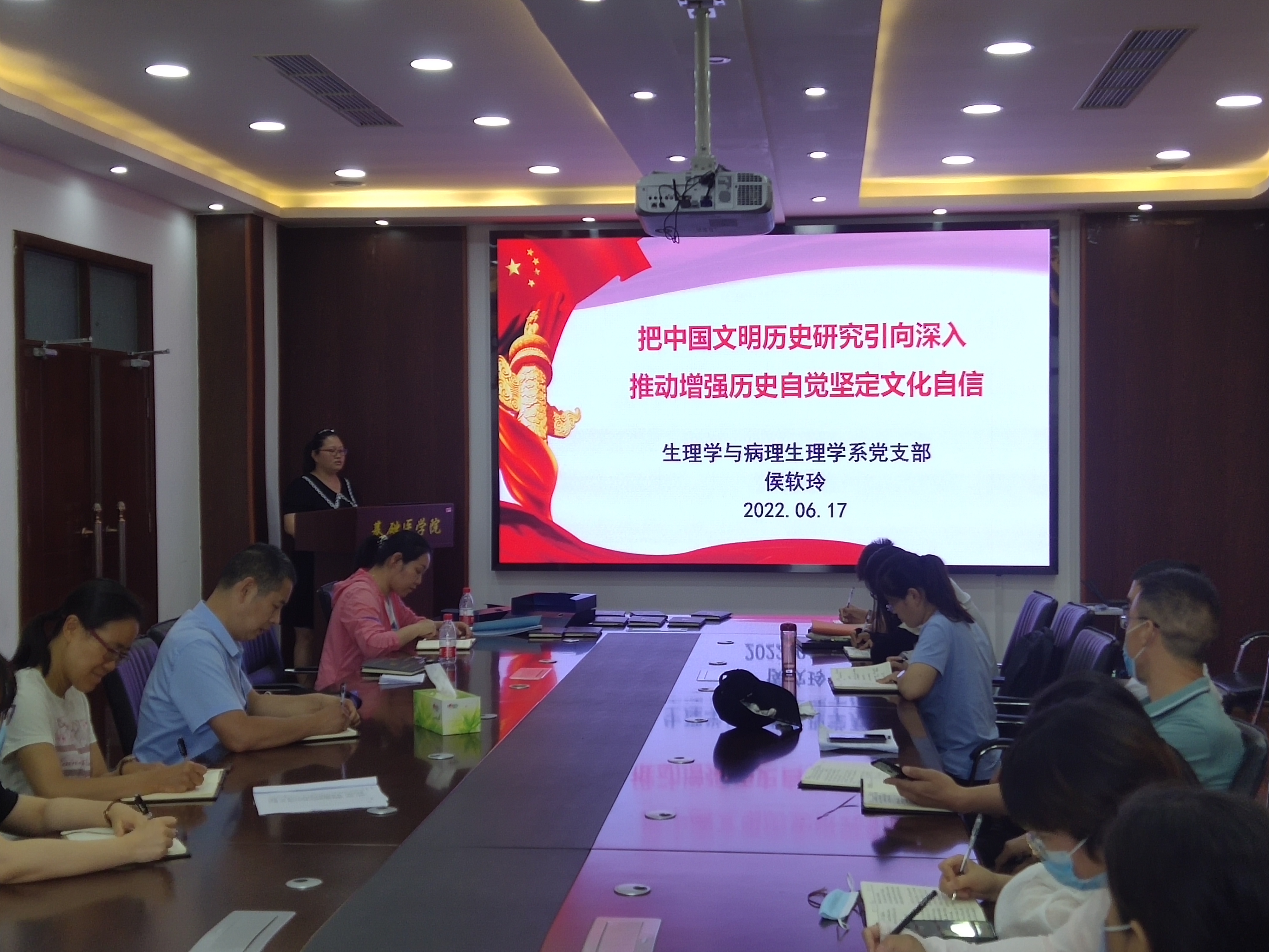 2022年6月17日上午,在新实验楼六楼会议室,进行学系党支部6月份主题党日活动,由支部书记侯软玲主持、书记侯软玲同志讲党课,通过PPT讲解的方法,来共同学习了《把中国文明历史研究引向深入,推动增强历史自觉坚定文化自信》。最后全体党员进行了集体讨论。