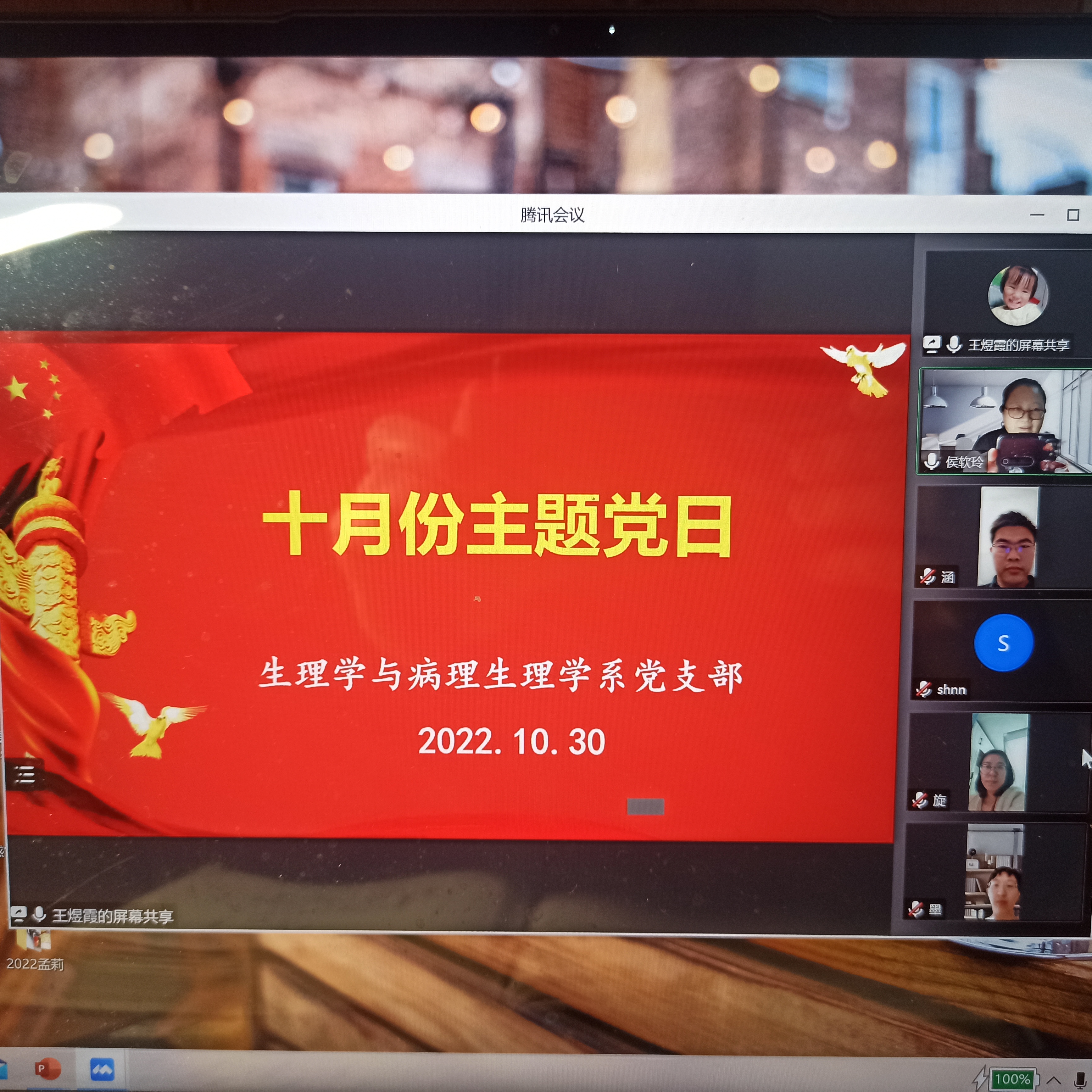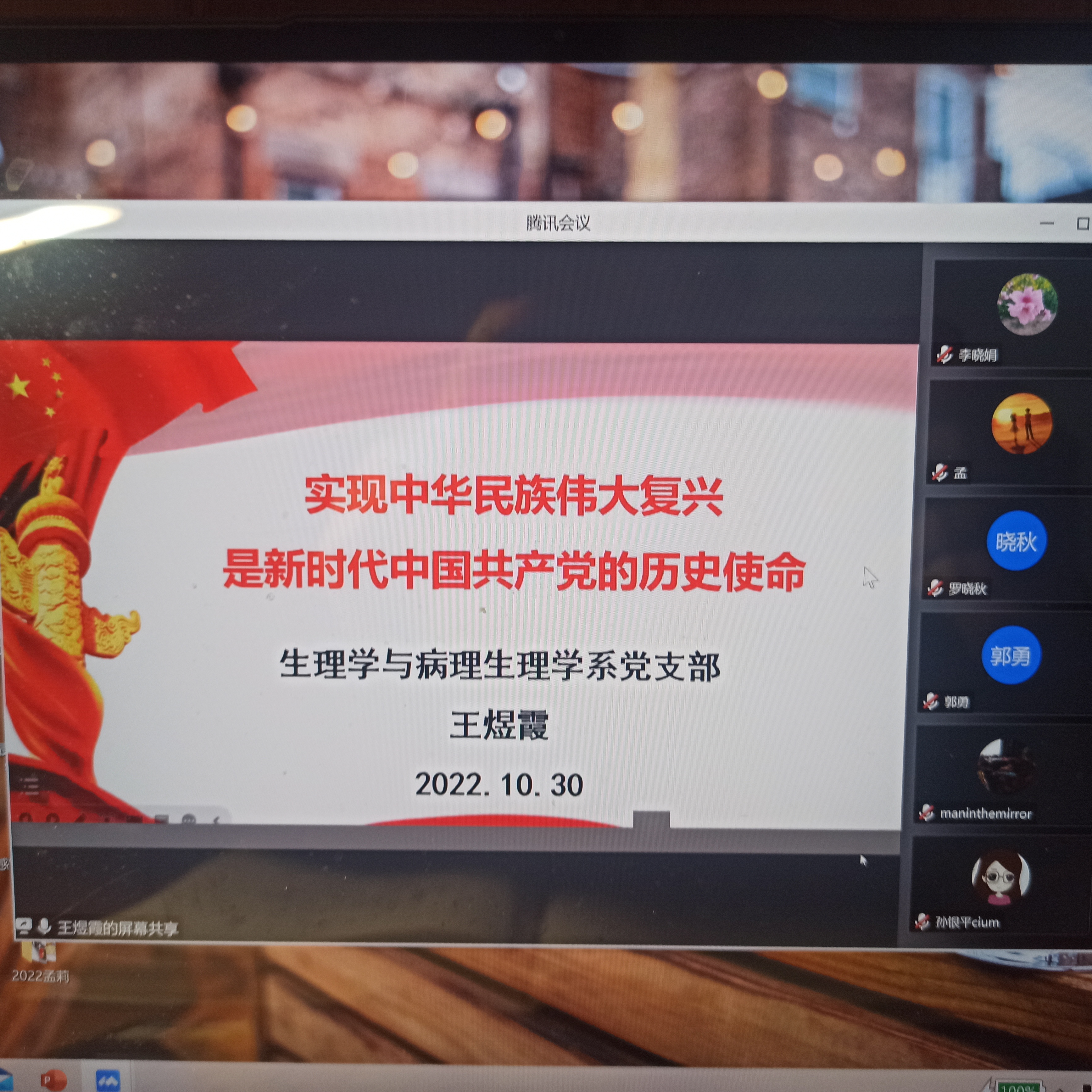 2022年10月30日,通过腾讯会议,进行学系党支部10月份主题党日活动,由支部书记侯软玲主持、王煜霞同志讲党课,通过PPT讲解的方法,来共同学习了《实现中华民族伟大复兴是新时代中国共产党的历史使命》。最后全体党员进行了集体讨论。