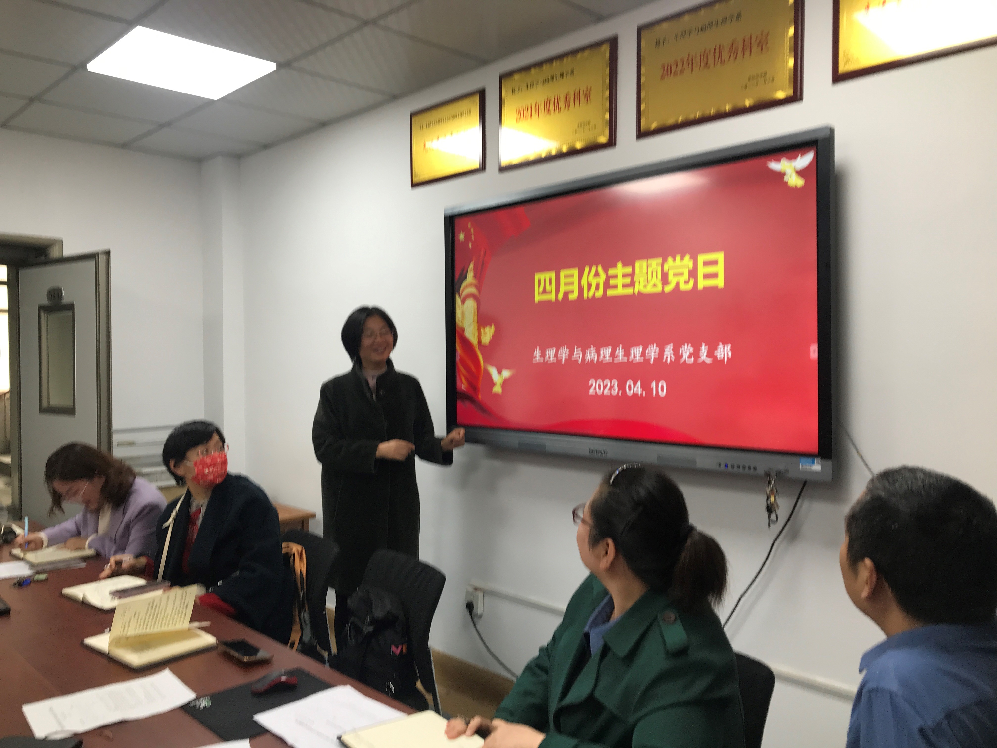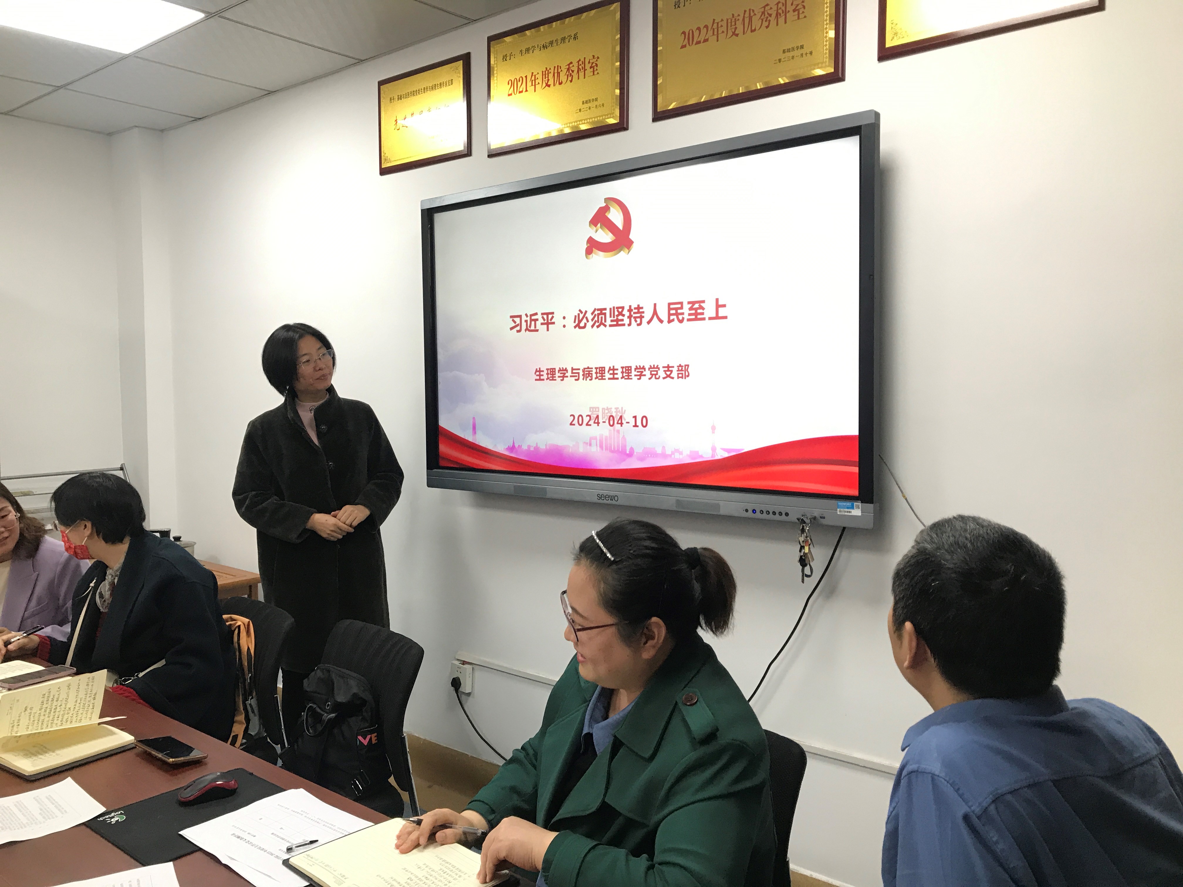 2024年4月10日,生理学与病理生理学系党支部,在325会议室进行主题党日活动,此次活动由支部书记侯软玲主持、罗晓秋主讲《习近平:必须坚持人民至上》。之后党员们根据学习主题进行了讨论。