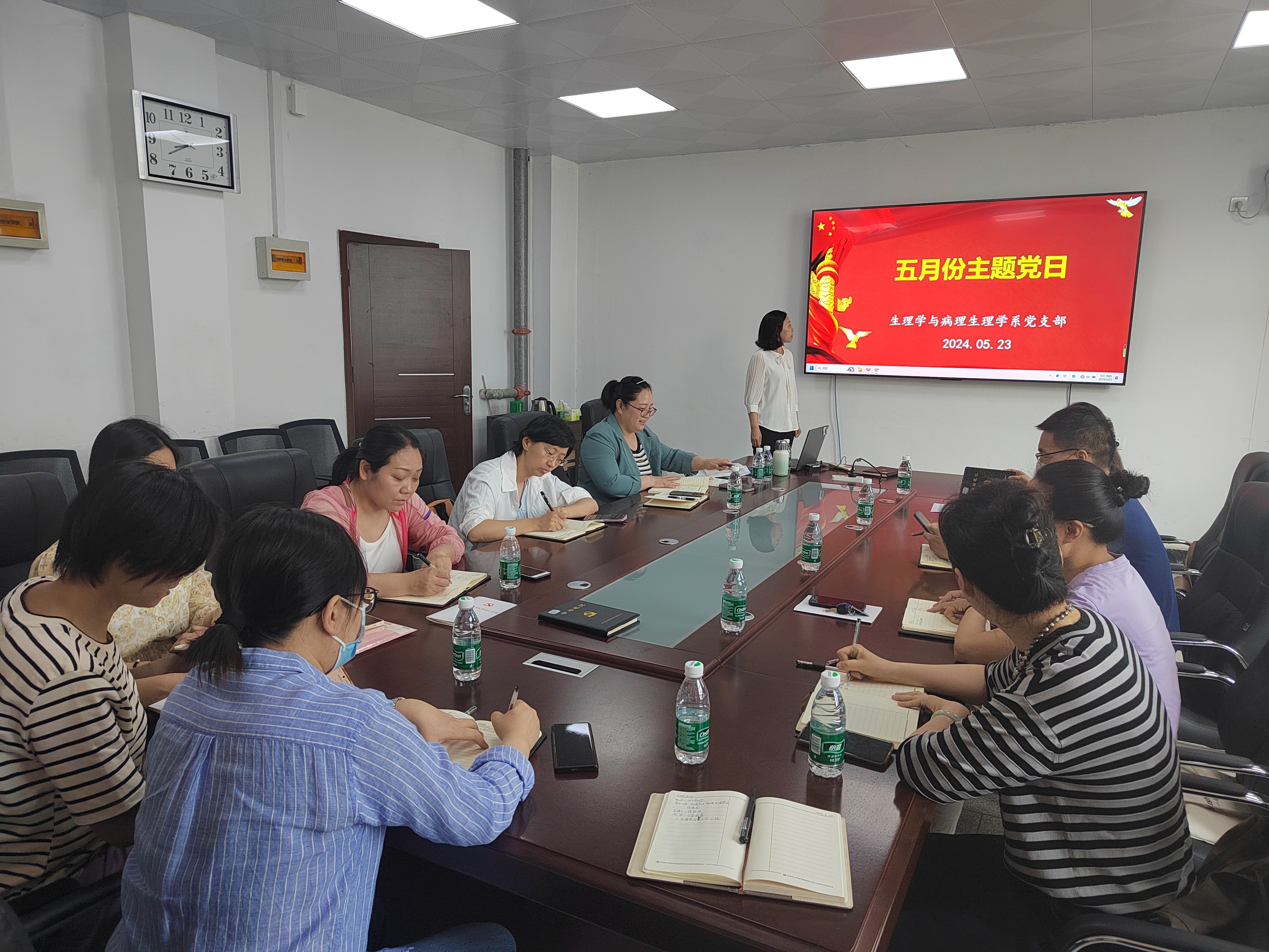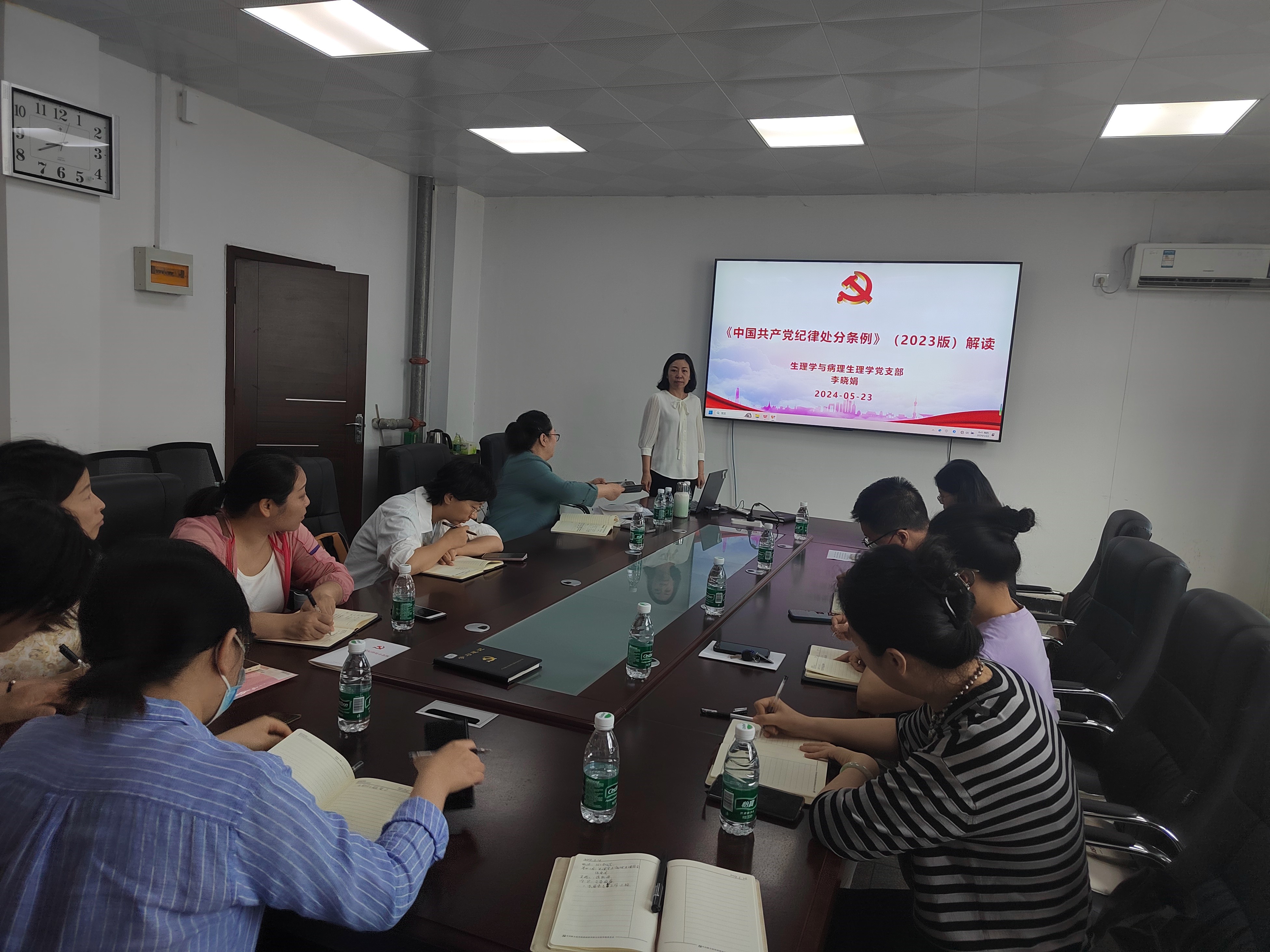 2024年5月24日,生理学与病理生理学系党支部,在331会议室进行主题党日活动,此次活动由支部书记侯软玲主持、李晓娟主讲《中国共产党纪律处分条例》(2023版)解读。之后党员们根据学习主题进行讨论。