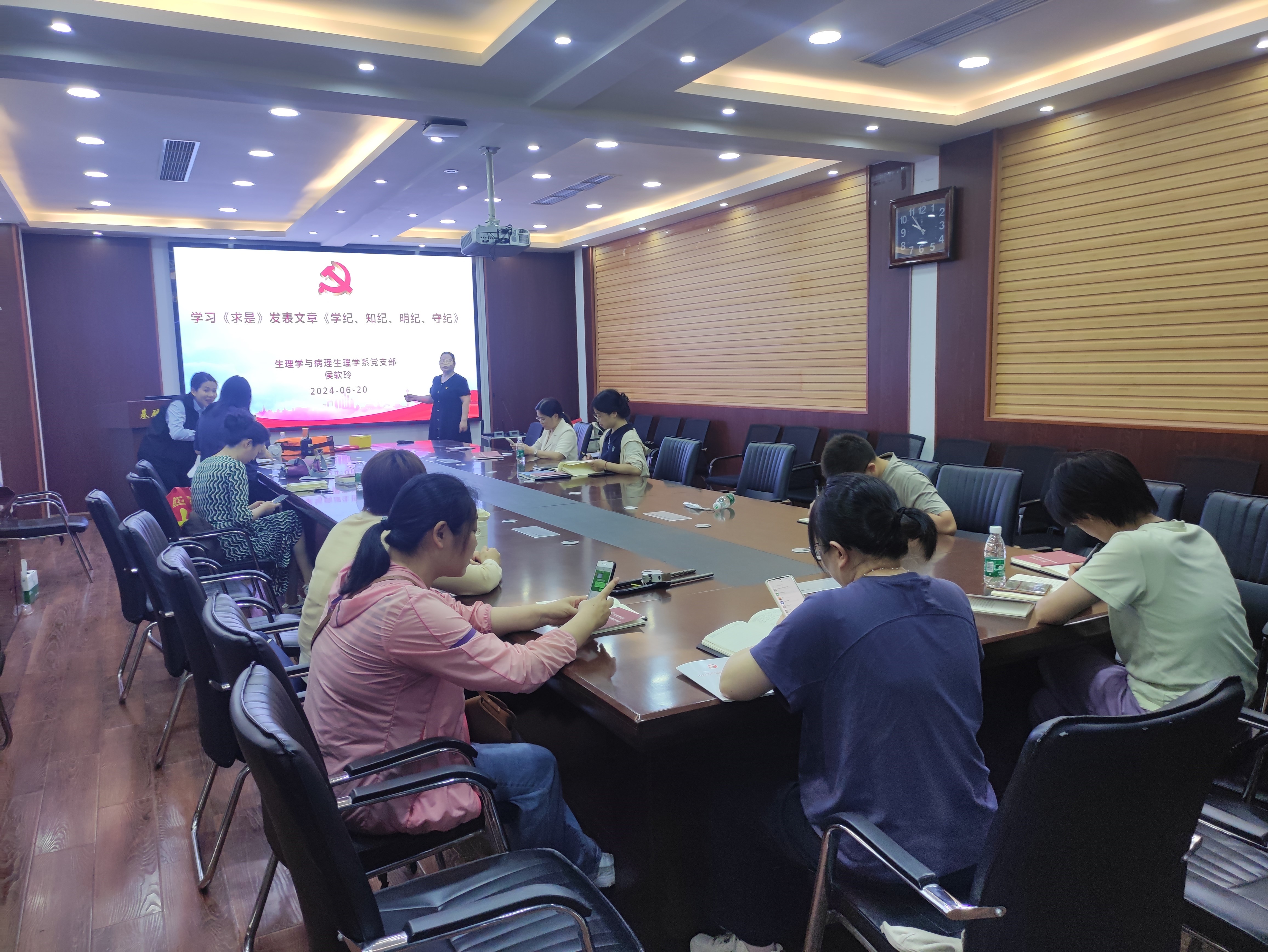 2024年6月20日,生理学与病理生理学系党支部,在求是楼六楼会议室进行主题党日活动,此次活动由支部书记侯软玲主持、侯软玲主讲学习《求是》发表文章《学纪、知纪、明纪、守纪》。之后党员们根据主题进行讨论。