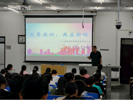 会上,学生辅导员袁永庆以“凝聚共识,共启新程”为主题展开分享。他首先全面总结了全体同学上一年在学业、生活等方面的表现,肯定成绩的同时指出不足。随后,他针对在学生中出现的问题,为两个年级学生做出发展规划,从课程学习、技能提升、职业准备等方面提出建议,着重寄语同学们要立足当下,清晰规划人生目标,走好医学成长之路 。
