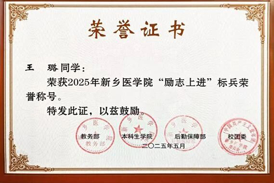“不积跬步,无以至千里;不积小流,无以成江海。”作为学生,王璐始终将“博学笃行”作为学习准则,课堂上专注汲取知识,课后主动拓展专业视野,以“勤思考、善总结”的态度攻克专业难题。她也注重理论与实践结合,主动向老师请教科研思路,积极参与实验室基础技能练习,力求在专业领域扎实根基。在不懈地努力下,她在2023-2024学年以专业综测第二的好成绩荣获国家励志奖学金,并摘得“三好学生”、“三好学生标兵”、“励志上进”标兵等荣誉,以实际行动诠释“学贵有恒”的信念。