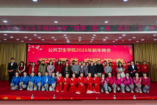 灯火璀璨庆元旦,歌舞飞扬迎新年。12月28日晚,河南医药大学公共卫生学院2026年“花开‘医’路,启程‘卫’来”新年晚会在博学楼第一报告厅隆重举行。学院党委书记刘荣勋、院长吴卫东、副院长范秉琳、张晨光与师生同聚一堂,喜迎新年。