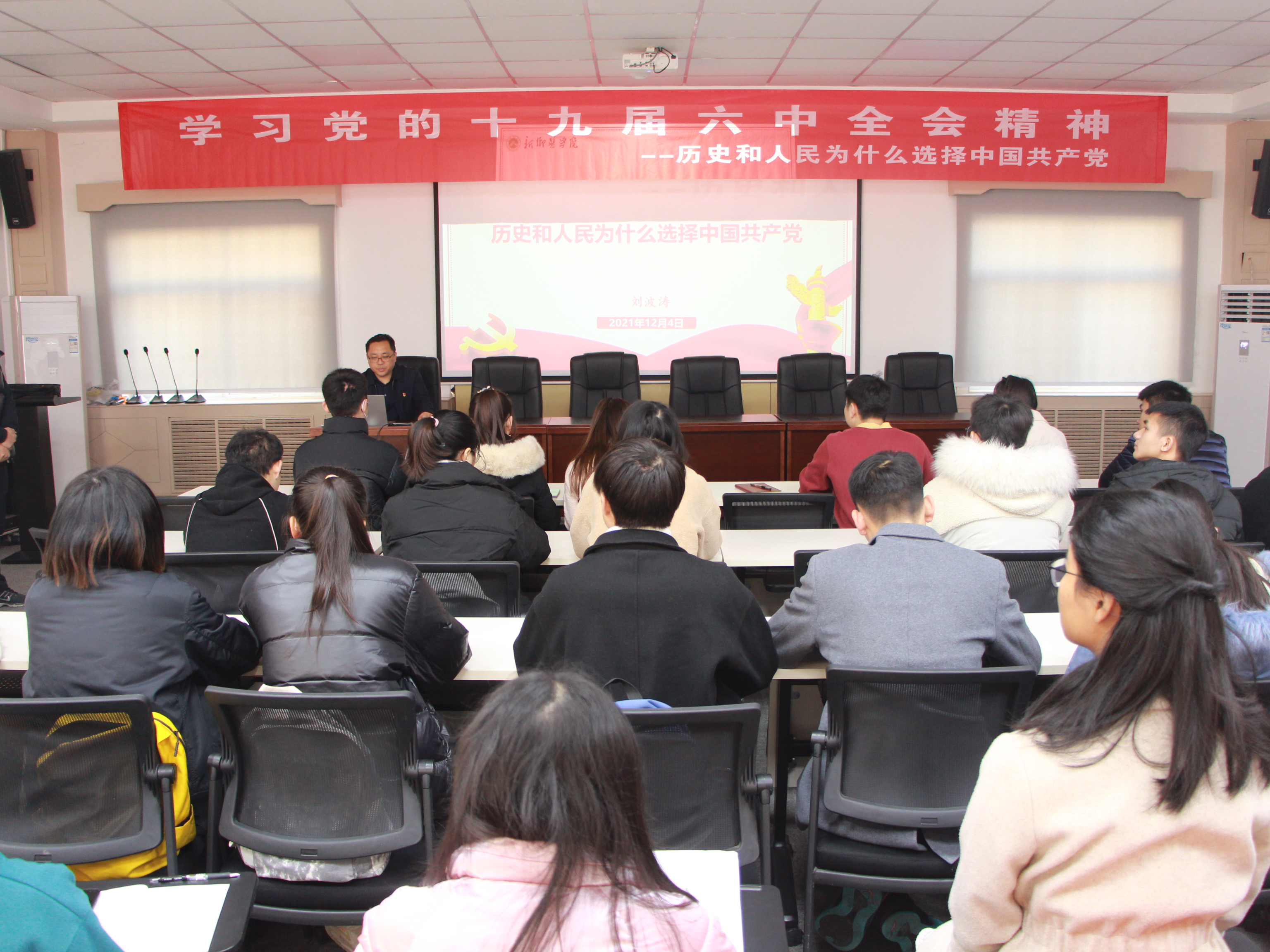 为认真学习宣传贯彻党的十九届六中全会会议精神,培养理想信念坚定的青年马克思主义者,12月4日,在南校区办公楼四楼会议室,我校“明德班”开展“学习宣传贯彻党的十九届六中全会精神”主题活动,党委宣传部副部长刘波涛作题为《历史和人民为什么选择中国共产党》的专题讲座。