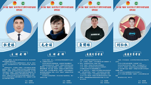 校学生会特邀基础医学院病理生理学系杜爱林老师、生命科学技术学院实验教学中心副主任毛会丽老师为大家做专题培训交流,基础医学院2020级临床医学专业角博琳同学和生命科学技术学院2020级生物技术专业刘征权同学交流分享参赛经验。