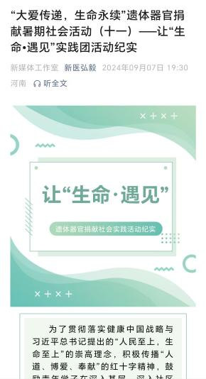 为贯彻落实健康中国战略与习近平总书记“人民至上,生命至上”的崇高理念,积极传播“人道、博爱、奉献”的红十字精神,鼓励青年学子在深入基层、深入社区的社会实践中长才干、增本领,保护人民生命健康,弘扬人间大爱,促进社会文明进步。我校于2024年7月至8月开展“大爱传递,生命永续”遗体器官捐献暑期社会活动,由校团委主办,弘毅书院、基础医学院承办。经申报、评审,共组建校级实践团队20支,采取返乡实践的形式,就近就便的原则开展,覆盖郑州、洛阳、开封、新乡等17个地级市和1个省直辖县级市,实现了河南省全覆盖。