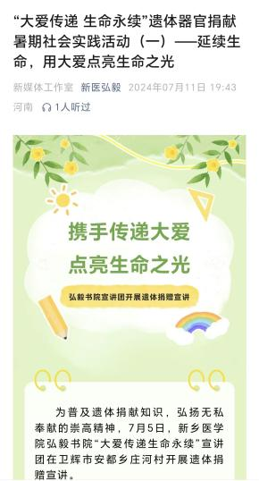 各地市活动全面铺开,志愿者们深入医院、公园、学校、社区、街道、学校、敬老院、文化广场等,通过设义诊点、慰问老人、以“生命的延续”为主题进行绘画、手工创作等活动来传递遗体捐献理念,大力开展遗体器官捐献知识讲座、发放宣传页、互动答疑解惑。让公众全面了解遗体器官捐献的相关知识,包括捐献的具体流程、法律规定、可捐献的器官种类等信息,消除因信息不对称而产生的误解和偏见,改变社会传统观念,引导公众树立正确的生死观,让人们认识到遗体器官捐献是生命延续的一种高尚方式,减少对死亡和遗体捐献的忌讳心理,营造积极正面的社会舆论环境,激发人们的社会责任感和爱心,使遗体器官捐献成为一种被广泛认可和尊重的社会行为,鼓励更多人自愿加入到遗体器官捐献者的行列,促进医学研究以及推动医疗技术的发展。