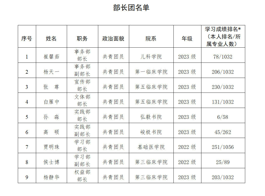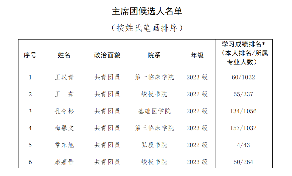 通过各学院、书院团组织、学生会推荐,同学自荐等方式,报学院、书院党组织同意,经笔试、面试环节,由党委本科生工作部、校团委、校学生会组织联合审查通过,产生2024-2025学年校学生会主席团候选人、部长团成员名单,现将结果公示如下: