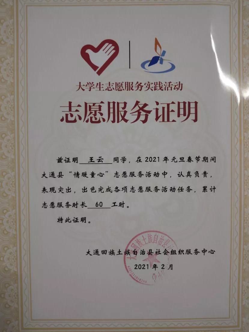 “在我们回族有一句谚语,叫做‘亲帮亲,邻帮邻,亲邻团结一家人’。能够关怀邻里、服务社区、回报社会,即便疫情防控形势依然严峻,我的家人还是为我成为一名青年志愿者而感到欣慰和自豪。”2月7日下午,在大通县民政局召开的志愿活动总结会议上,王云收到志愿服务证明后这样说道,医者仁心、治病救人,自己初中时便已萌生做一名医生的理想,而当他真正以一名医学生的身份参与家乡抗疫志愿活动时,他感到学习医学不仅是对生命的敬畏,更是对人生命价值的提升。同乡村居民、社区孤寡老人、辖区留守儿童的温情互动,令他对新医校训中“至爱致用”的理解更进一步,坚定他医路求学的执着信念。