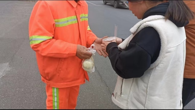 “传承雷锋精神,于小处见大爱”送爱心志愿活动为学校周边的环卫工人送去温暖。该活动的内容是由社会实践部副部长王翔辉带领社会实践部3名干事为环卫工人和交警赠送免费的早饭、矿泉水以及毛巾,同时也帮助清洁工们清扫街道。为了使活动能够顺利进行,在活动进行前,志愿者们提前了解到环卫工人和交警们的工作时间、工作地点并准备好要发放的物资。当志愿者们为他们送上物资时,他们很是喜悦与感动。通过此次活动,志愿者们不仅体会到他们早出晚归,风雨无阻的生活的艰辛与不易,还见证了他们的默默劳作,更深刻认识到每个人都应该珍视这份劳动成果。