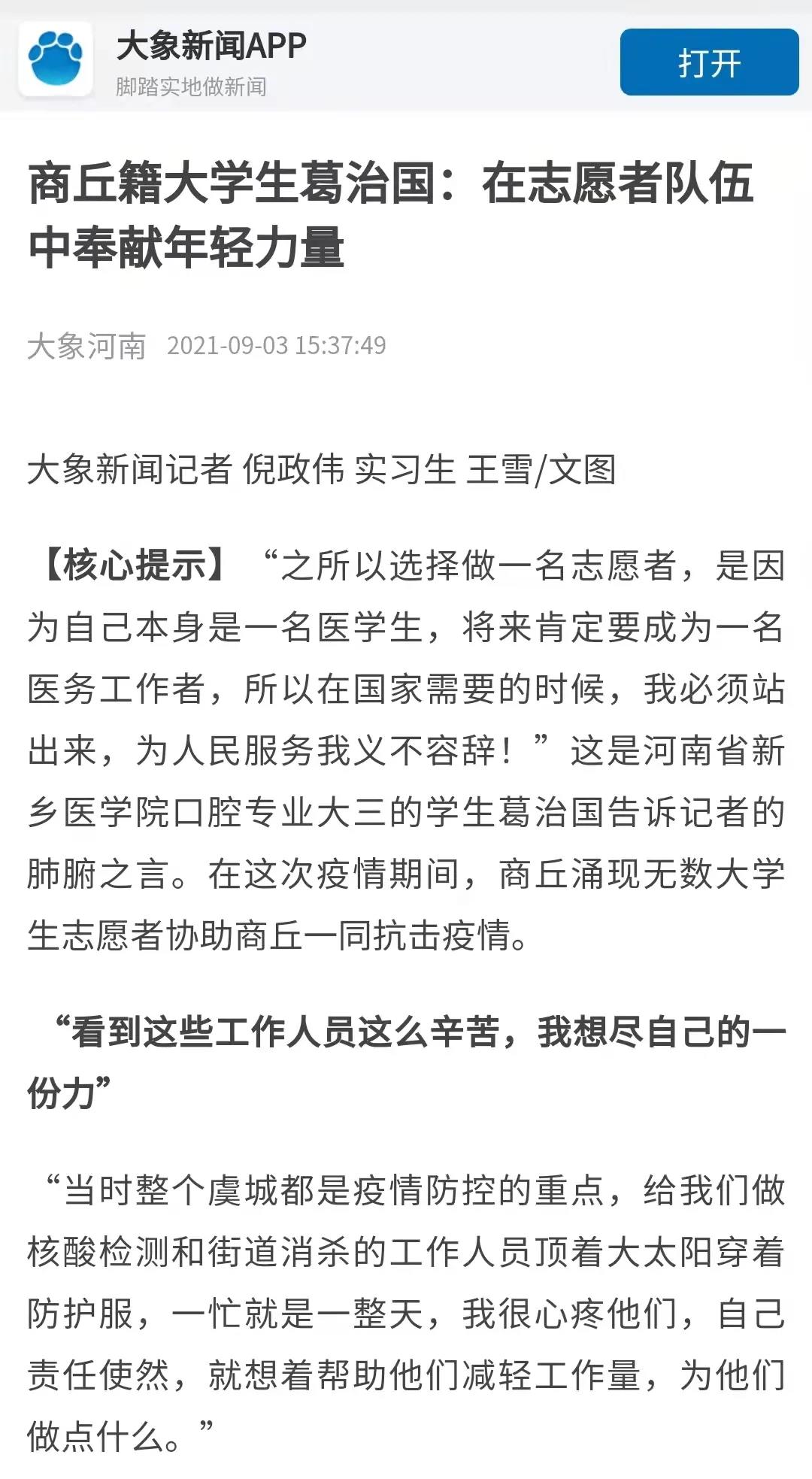 商丘籍大学生葛治国:在志愿者队伍中奉献年轻力量