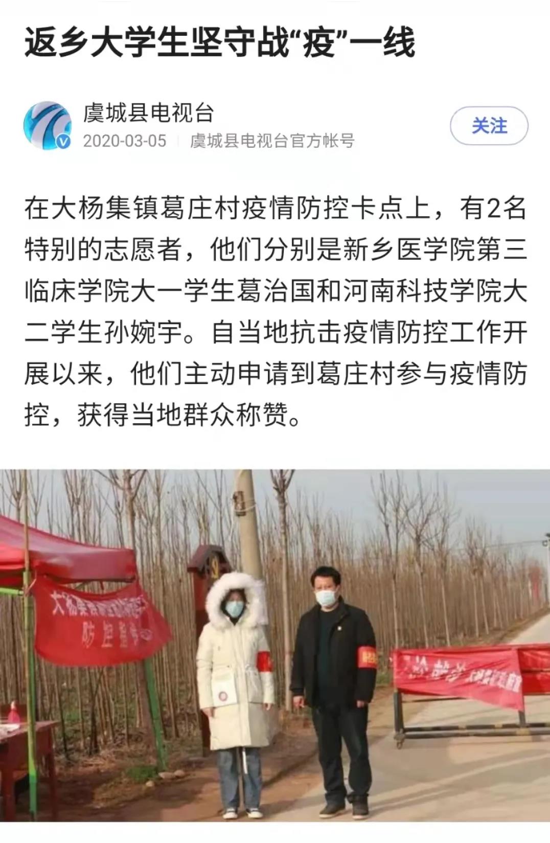 越是危难时刻,越显责任担当。我校第三临床学院学生葛治国挺身而出,深入中高风险区河南省商丘市虞城县刘集乡参与志愿服务。在接受疫情防护及工作知识培训后,葛治国迅速投入工作岗位,街道消杀、核酸现场秩序维护、信息登记等,连续开展了为期30天的早八点到凌晨十二点的志愿工作。在接受乡政府表扬时葛治国提到,他只是众多大学生志愿者中的普通一员,作为医学生,从踏入医学殿堂的那一刻起,便决心在国家和人民需要的时候,义不容辞奉献个人力量。葛治国的志愿事迹受到虞城县电视台、东方今报媒体报道,被今日头条、大象新闻媒体转载。