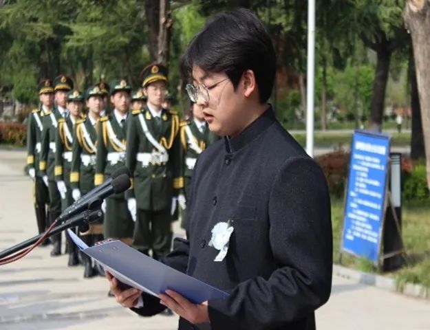 学生代表李存森带领全体志愿者庄严宣誓,言辞铿锵,澎湃激昂。宣誓完毕,国旗护卫队代表在庄重的《献花曲》中向革命烈士敬献花篮,全体人员在烈士纪念碑前鞠躬致敬、肃立默哀。