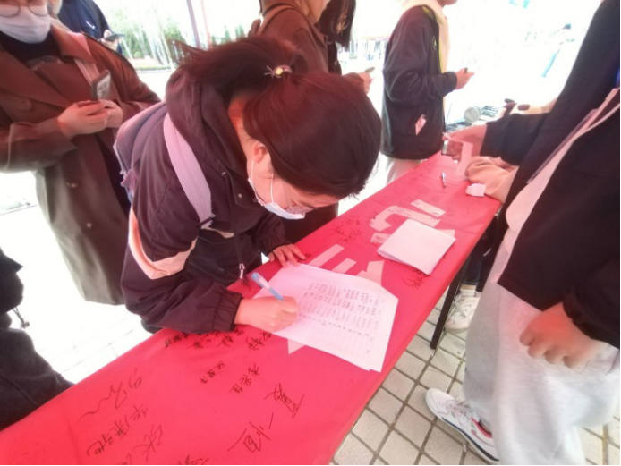 同学们有序在条幅上签字