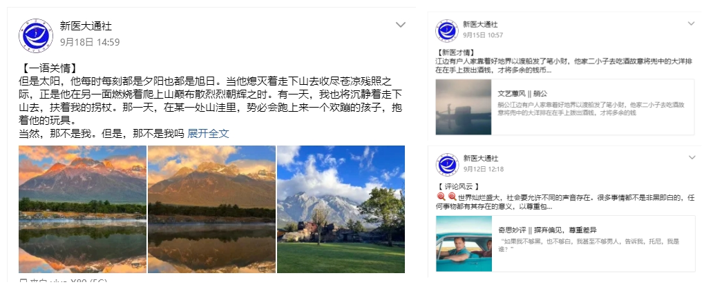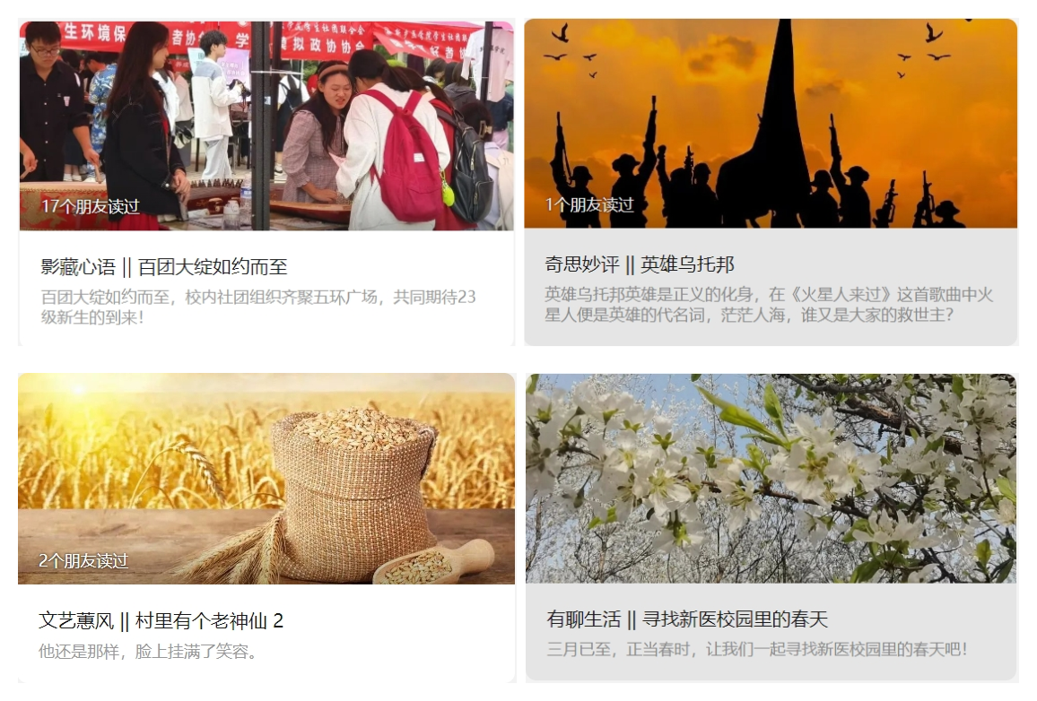 运营官方QQ“新医大通社”365天不间断推送,日均推送量5—10条,灵活运用媒介文本“短、平、快”的特点,与微信公众号联动,关注社会热点、速推突发事件、追踪新闻长线,并以【一周新闻速递】【一语关情】【新医才情】【五洲茶亭】【评论风云】等原创栏目分享美文佳句,传播动态资讯,累计粉丝量超两千三百人,获赞数10.2万。