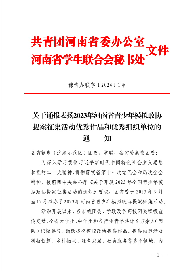 近期,由共青团河南省委办公室、河南省学生联合秘书处联合举办的2023年“河南省青少年模拟政协提案征集活动”表彰情况公布。全省大学生、中学生和各行业青年共计 9 万余人(团队)积极参与,征集活动共评选出优秀模拟政协提案50件(大学组36件中学组8件、职业青年组6件)。我校《关于规范历史题材作品的提案》和 《关于保护数字资产继承的提案》2件作品获优秀模拟政协提案。