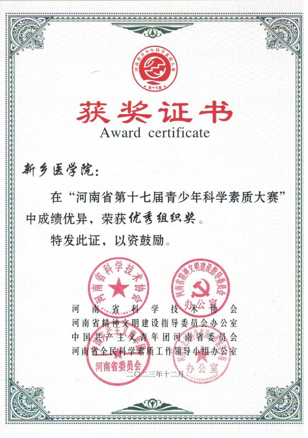 近日,由河南省科学技术协会、河南省精神文明建设指导委员会办公室、中国共产主义青年团河南省委员会、河南省全民科学素质工作小组领导小组办公室联合举办的“河南省第十七届青少年科学素质大赛”获奖名单公布。