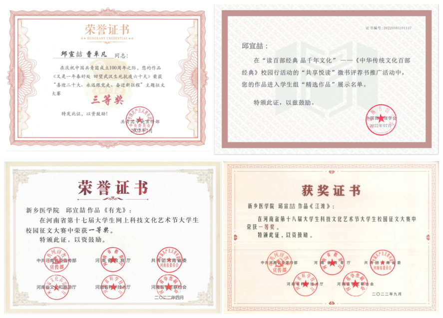 阅红书品墨韵坚定理想信念, 为宣传守初心肩责成才成长。 自2019年入校成为一名学生记者以来,他先后获国家级文学奖4件,在高教系统及社会层面获省级文学奖11件,校级文学奖一等奖15件;于人民日报客户端、新华网客户端等主流媒体平台刊发对外报道124篇,多篇评论被中国经济网、中国工人网转载,在校内媒体撰写报道109篇,总计浏览量约四百万。担任学校大学生通讯社第十九、二十任社长期间,参与打造"学习读书会"思政项目,获2020年度河南省“活力杯”三等奖;热议思政教育、全国两会、疫情防控,受中国青年网、中国教育新闻网等媒体报道23次;带领校媒组织以全省第二成绩获2023年河南省“活力团支部”,五年来为全校培养四代学生记者近千人,连续三年获“优秀校园新闻工作者”称号。