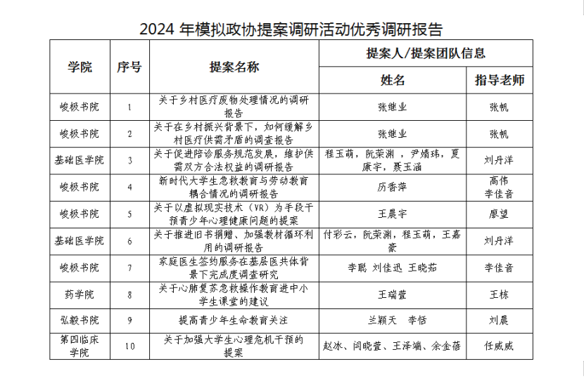 各基层团组织、学生组织:为深入学习宣传贯彻党的二十大精神,引导广大青年学生有序参与社会主义民主政治实践,准确理解全过程人民民主内涵实质,领悟新时代十年伟大变革背后的“制度密码”,坚定信念跟党走。校团委开展了我校青少年模拟政协提案调研活动。本次活动共征集调研报告189份,经专家评审,确定《关于乡村医疗废物处理情况的调研报告》、《关于在乡村振兴背景下,如何缓解乡村医疗供需矛盾的调查报告》等35份调研报告为优秀调研报告。