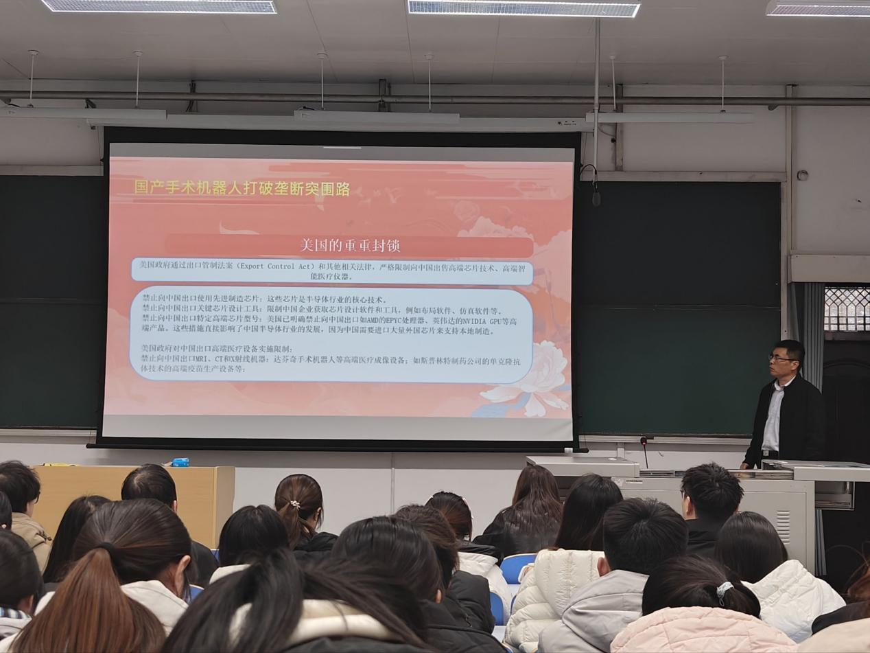 随后,王守英结合时代发展大势,阐释了“十五五”时期的重要战略地位,引导同学们认清当前科技发展与医疗健康领域的发展机遇,树立与时代同频共振的成长意识。他以国产手术机器人打破国外垄断封锁的奋斗历程为生动案例,讲述了我国医学工程领域从业者攻坚克难、自主创新的故事,激励同学们厚植家国情怀,增强专业自信与民族自豪感。