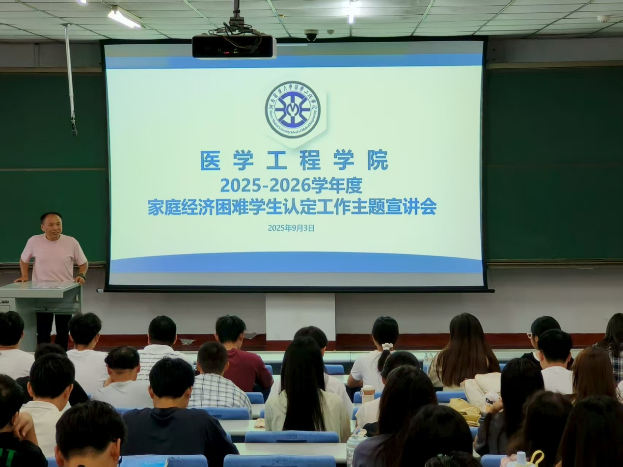 为确保每一位家庭经济困难学生“听得懂、会申请、得实惠”,激发学生自立自强的精神动力,营造“扶困更扶志、助学更育人”的浓厚氛围,医学工程学院于9月3日在3104教室举行“2025—2026学年度家庭经济困难学生认定工作主题宣讲会”。团委书记陈洪涛及医学工程学院在校全体学生出席参加,辅导员范亚桢主持会议。