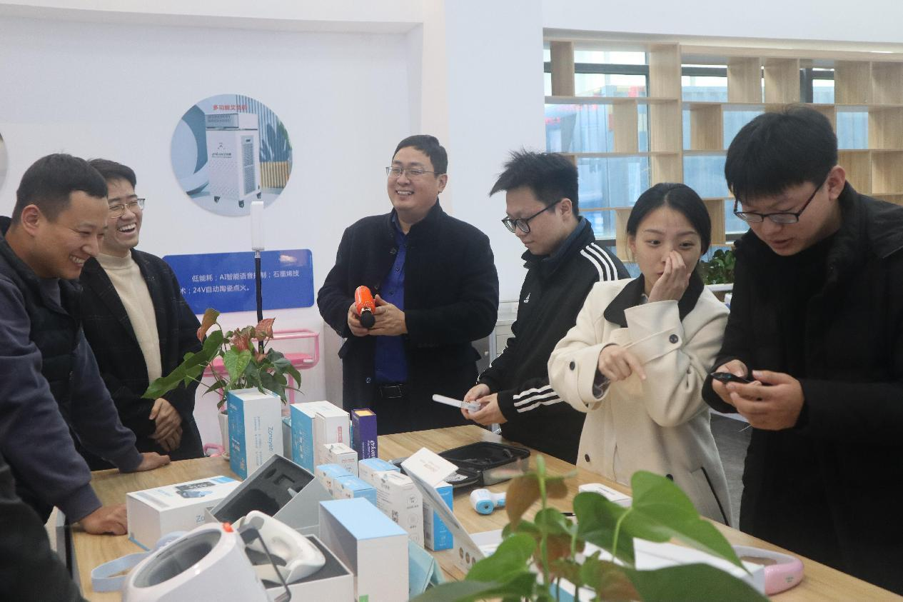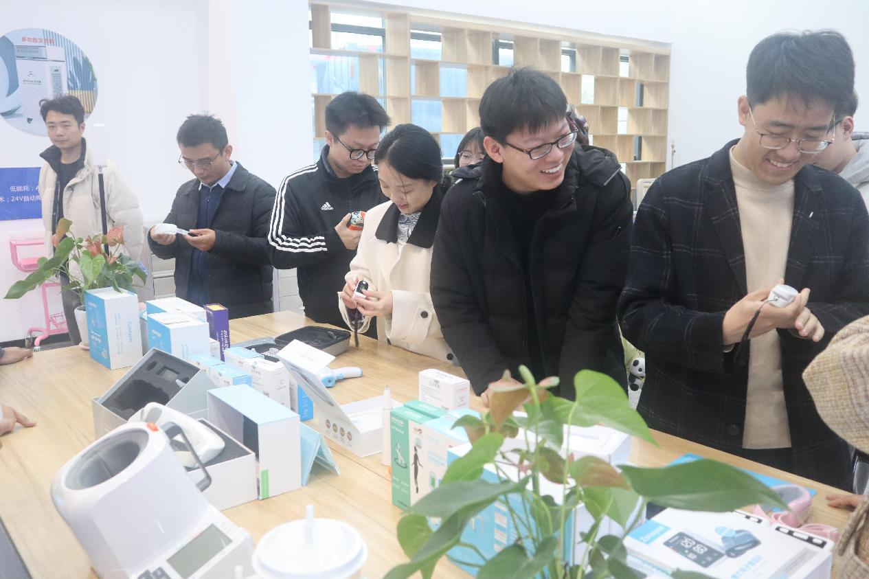 鑫磊峰公司负责人向赵俊强一行展示了公司生产的几款常用医疗器械,包括电子血压计、小型分子筛制氧机、医用压缩雾化器、指夹式脉搏血氧仪等,分别介绍其具体功能,着重讲解了它们在疾病预防和初步诊疗中的作用,并让同学们对器械进行实操,使得同学们在丰富见识的同时也切实学习到了相关医学知识。