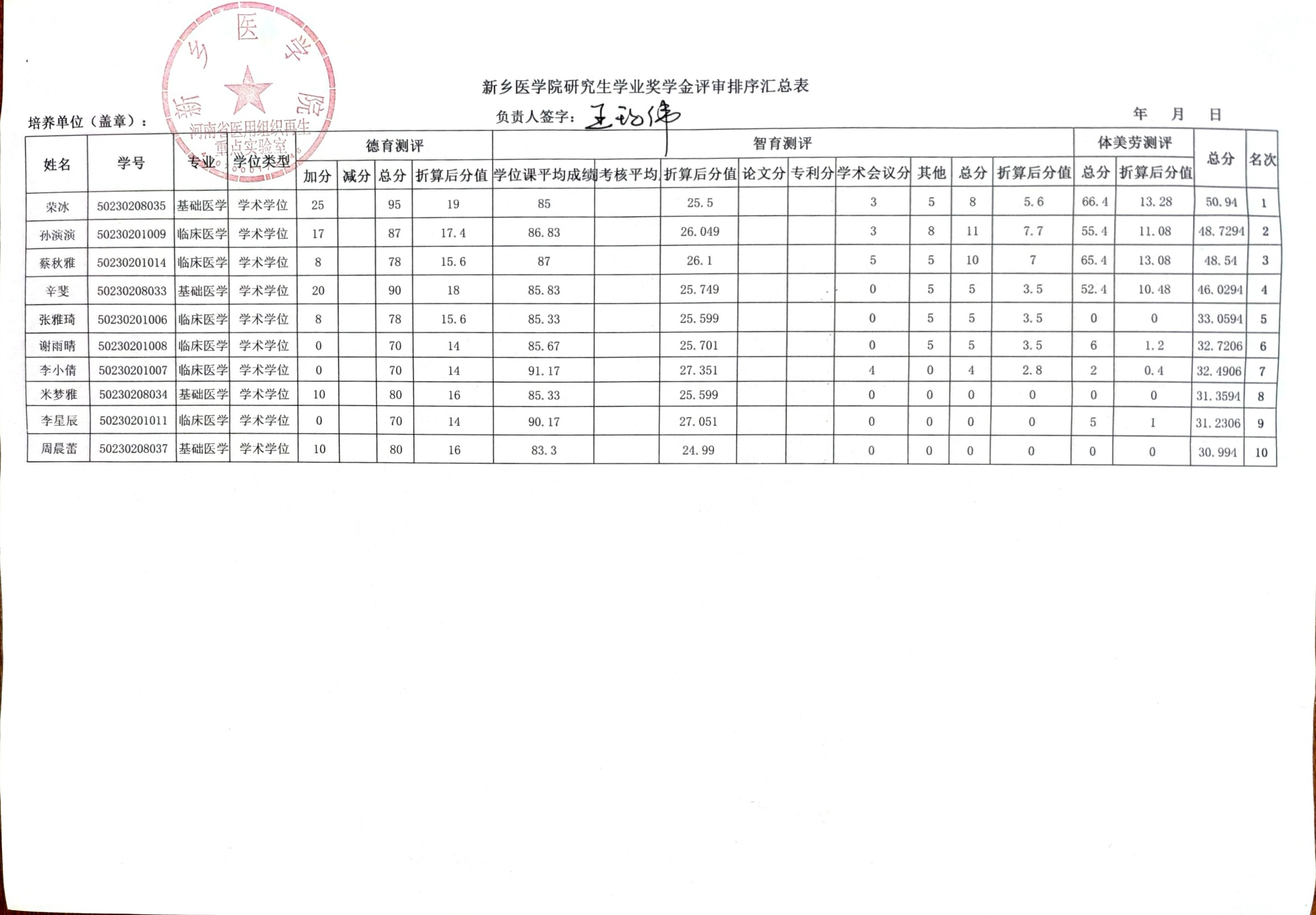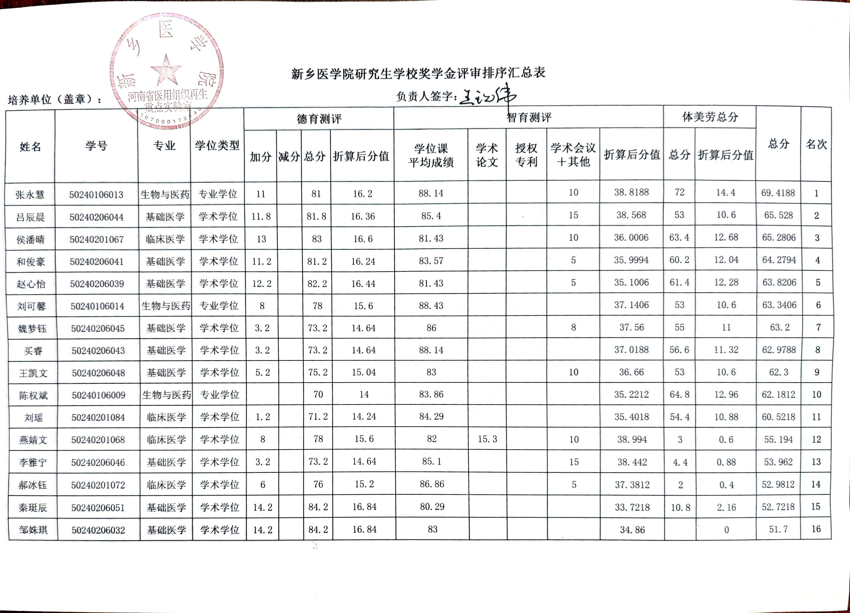 河南省医用组织再生重点实验室研究生奖学金评审结果公示